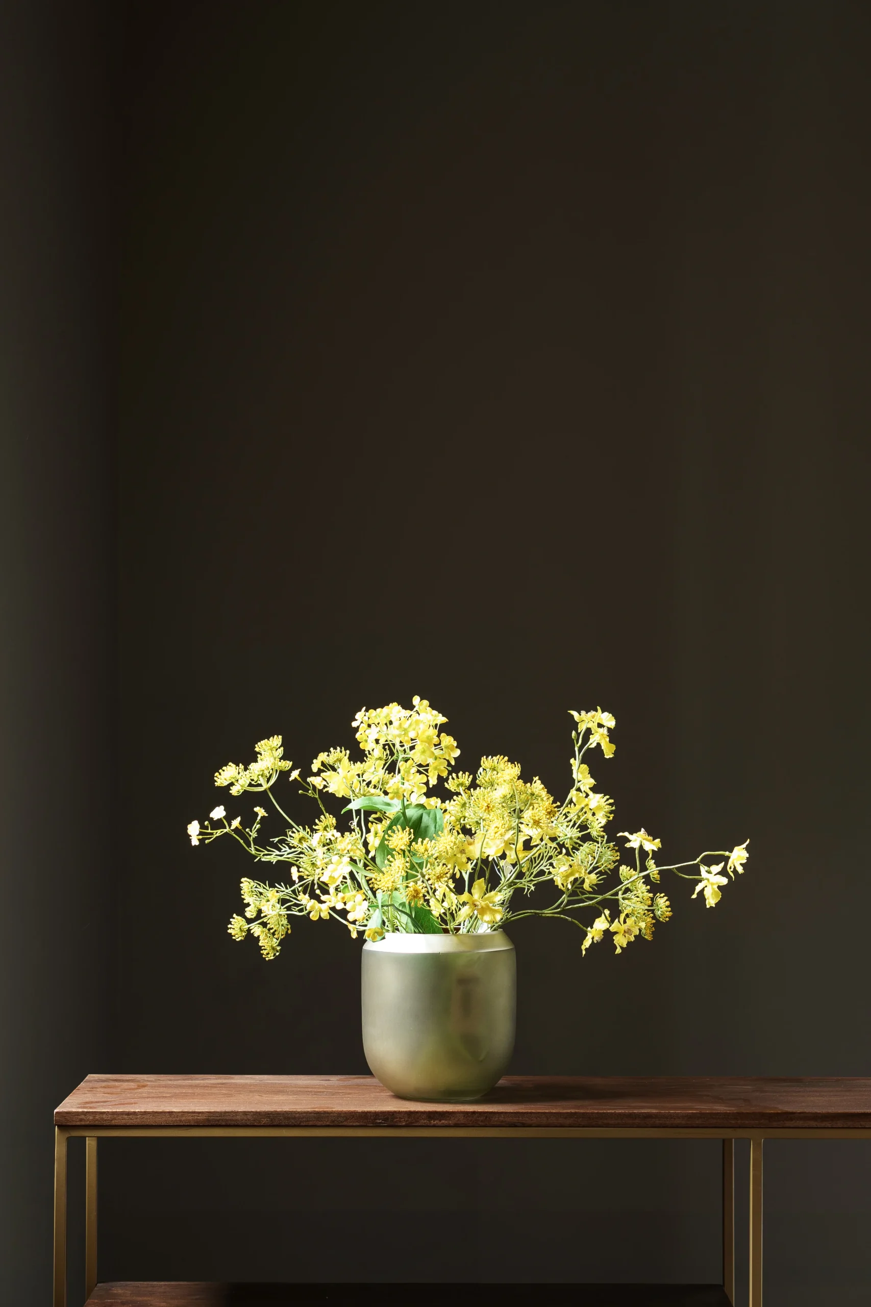 Trong không gian tối giản, bình hoa với những bông hoa trắng tinh khôi như những đốm sáng lấp lánh. Thiết kế hiện đại và nhẹ nhàng, tạo nên vẻ đẹp diệu êm, hài hòa với không gian xung quanh. Mỗi bông hoa như một cái nhìn sâu lắng, mang đến sự thanh thoát và thư thái cho người chiêm ngưỡng.