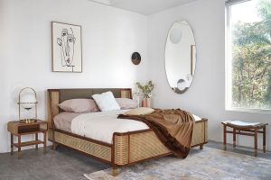 May leather bed is a combination of the main body made of Melaleuca wood, upholstered with leather and accented with rattan material for the headboard. Dark colors make the bedroom space cozy and closer. May beds have 2 sizes 1m6 and 1m8.