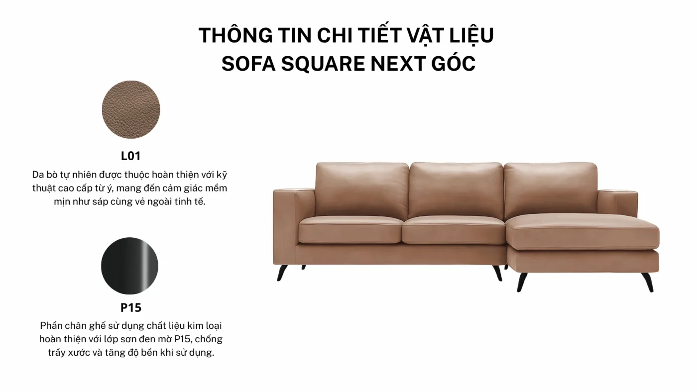 Với kích thước D2710/1670 – R1000 – C840 mm, sofa Square Next mang đến cảm giác cân đối và hiện đại. Thiết kế kích thước phù hợp cả cho không gian sống rộng rãi lẫn bố trí góc linh hoạt trong phòng khách.