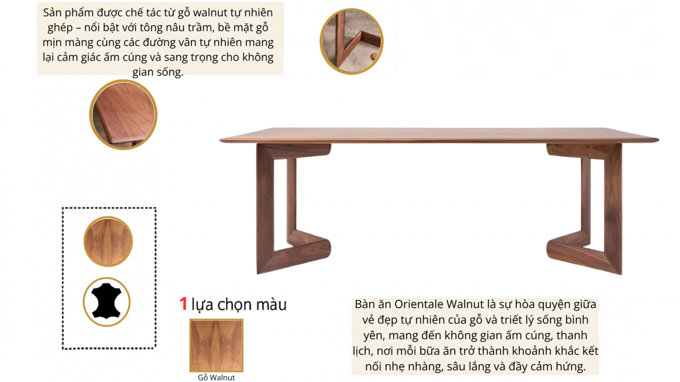 Bàn ăn 8 chỗ Orientale Walnut là sự kết hợp giữa vẻ đẹp hiện đại và cảm hứng phương Đông với thiết kế thanh lịch, tối giản, tôn vinh vẻ đẹp tự nhiên của gỗ walnut. Với mặt bàn rộng rãi và sắc nâu ấm, sản phẩm không chỉ là trung tâm sum họp gia đình mà còn là điểm nhấn sang trọng cho không gian sống, thể hiện giá trị bền vững và cảm xúc gắn kết qua triết lý thiết kế nhân văn.