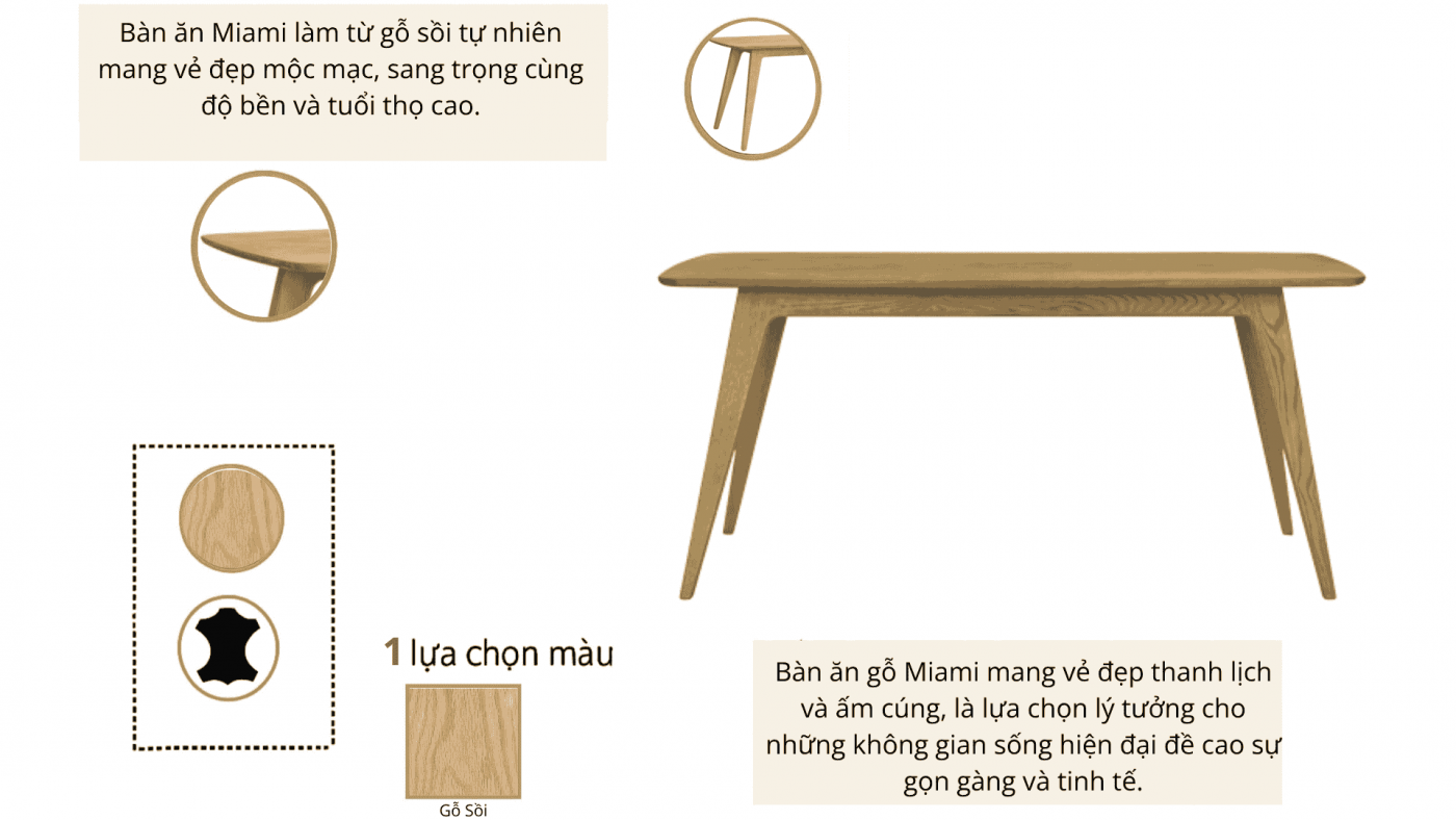 Bàn ăn Miami được làm chính từ ván MDF chống ẩm cao cấp, phần dưới được làm từ gỗ Sồi trắng nhập khẩu từ Mỹ tạo nên sự chắc chắn cho sản phẩm. Đây là sự lựa chọn hoàn hảo cho không gian phòng ăn mang đậm phong cách Bắc Âu