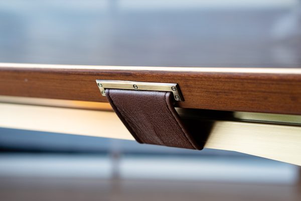 Bàn ăn Maxine là một thiết kế tối giản với bốn chân inox màu gold thuôn dài mang kiểu dáng thanh thoát. Mặt bàn gỗ MDF Veneer recon walnut cùng những đường vân uốn lượn tự nhiên tạo vẻ ngoài bắt mắt. Sự kết hợp hài hòa giữa màu nâu trầm với màu ánh kim tạo nên nét sang trọng và thanh lịch cho không gian phòng ăn hiện đại.