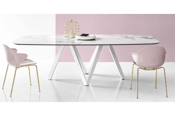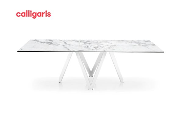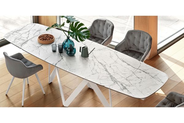 Bàn ăn mở rộng Cartesio Ceramic White P2C toát lên vẻ sang trọng, cầu kỳ nhờ vào thiết kế độc đáo bởi 4 chân kim loại đánh bóng hình chữ V ngược. Mặt bàn Ceramic kính cường lực cao cấp trắng sang trọng và trang nhã. Vốn từ nguyên bản là những chiếc bàn cố định, Cartesio hiện đại được thay đổi để có thể mở rộng 2 bên thêm 40cm, phù hợp với công năng, tăng thêm diện tích sử dụng. Bàn ăn Cartesio được đánh giá là một sản phẩm chất lượng và đa năng cho không gian phòng ăn.