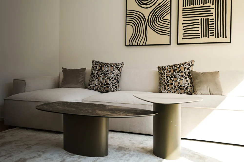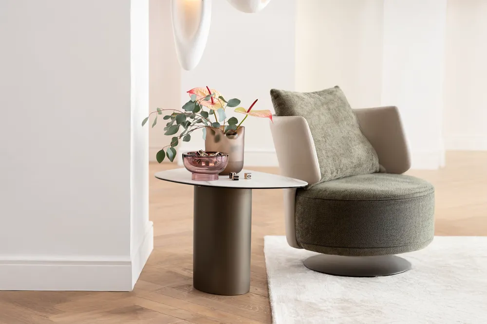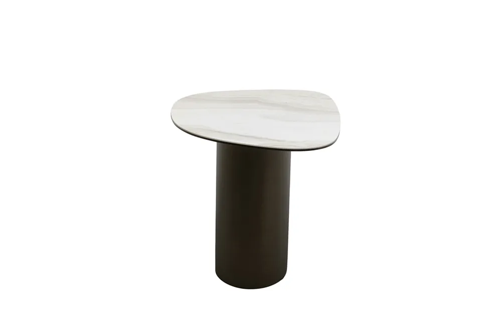 Bàn Bên Paso 75×50cm nổi bật với thiết kế hiện đại, dáng mặt bo mềm như giọt nướ, tạo cảm giác thanh thoát nhưng vẫn vững chãi. Mặt bàn kết hợp gốm cao cấp và kính cường lực an toàn giúp bền bỉ, dễ vệ sinh, phù hợp đặt cạnh sofa, giường ngủ hoặc làm bàn trang trí ở sảnh/hành lang. Khung thép sơn tĩnh điện chắc chắn, tông màu tối giản dễ hòa vào nhiều phong cách nội thất.