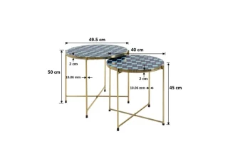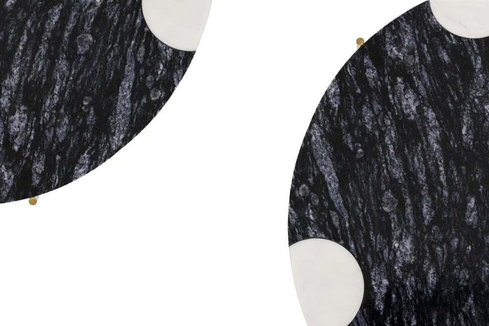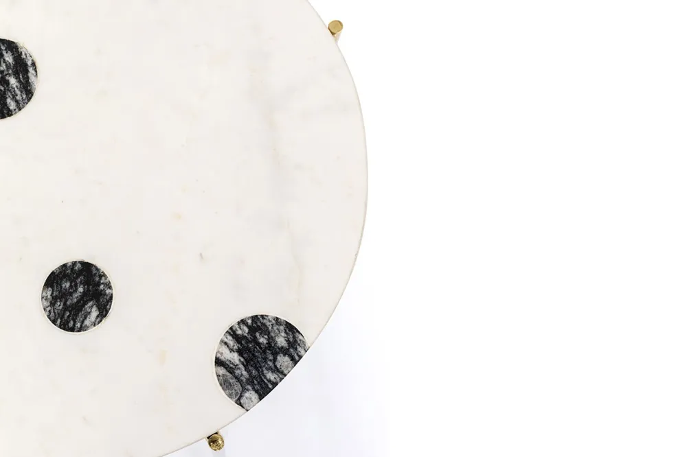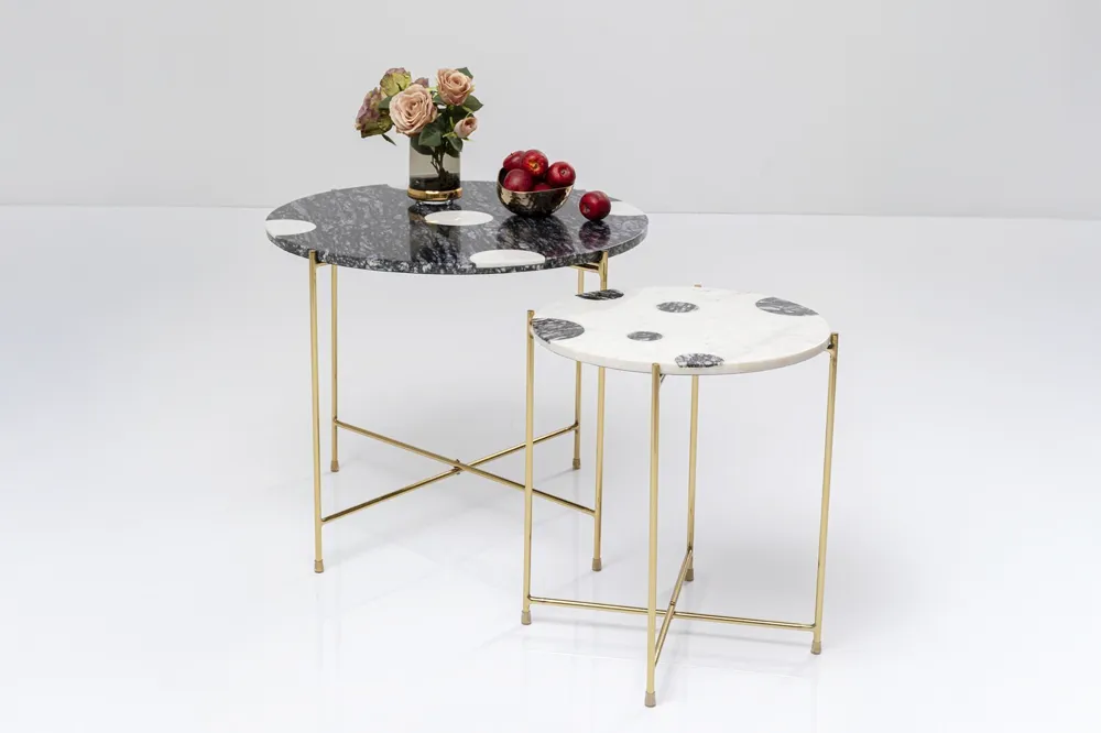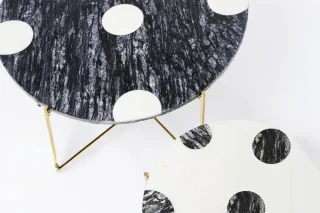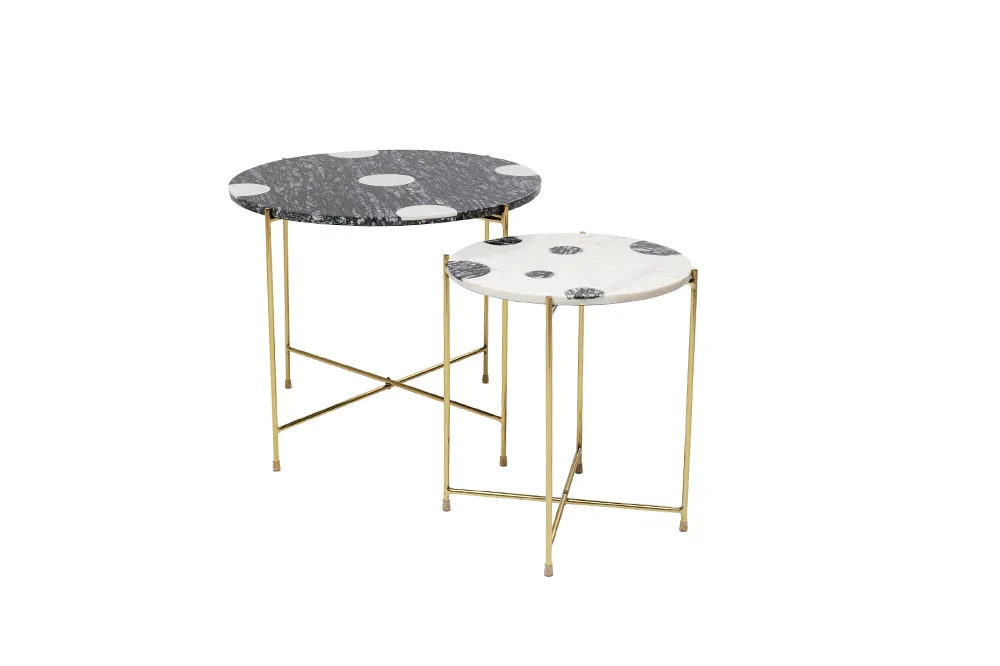 Bộ 2 Bàn Bên Tròn Amba tạo điểm nhấn với mặt bàn họa tiết chấm bi đen–trắng thủ công trên nền hiệu ứng marble. Thiết kế 2 kích thước (bàn lớn 50×50×50cm, bàn nhỏ 40×40×45cm) dễ linh hoạt bày trí như bàn cạnh sofa, bàn đầu giường hoặc góc décor. Khung thép mạ tông đồng thau thanh mảnh giúp tổng thể nhẹ nhàng nhưng vẫn chắc chắn, hợp không gian Modern, Contemporary hoặc Eclectic.