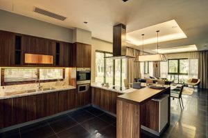 Thùng MFC chống ẩm, cửa, mặt hộc kéo, gỗ oak, MDF veneer teak recon, bản lề, đế bản lề, nêm giảm chấn Blum, kính trắng tủ treo, tay nắm, ray thường Hafele