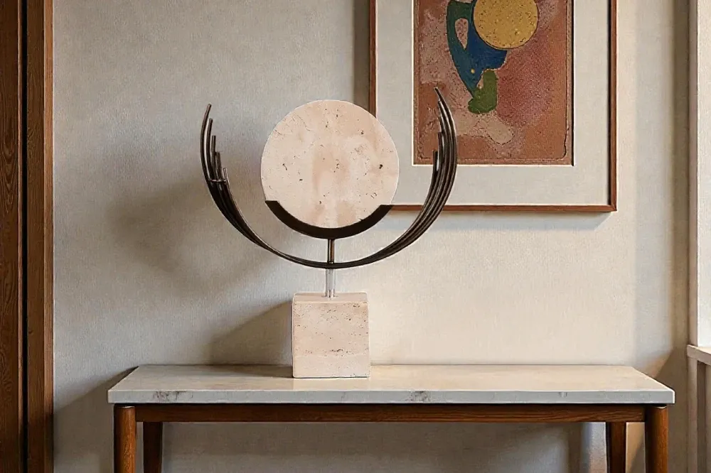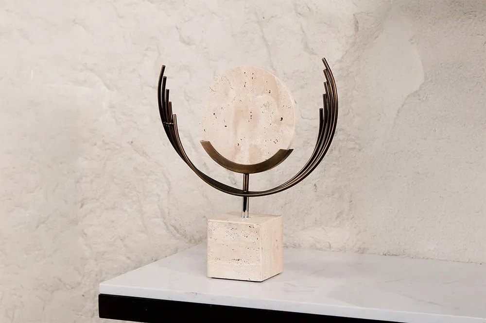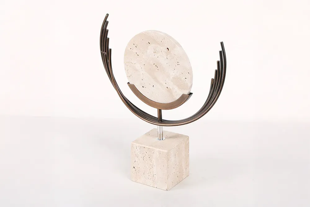 Tượng trang trí Lunar Balance lấy cảm hứng từ khoảnh khắc mặt trăng vừa nhô lên khỏi đường chân trời. Khối đá tự nhiên tròn mộc mạc được ôm trọn bởi những vòng cung kim loại màu đồng cháy, tạo nên bố cục cân bằng giữa chất liệu lạnh của đá và sắc ấm của kim loại. Phần đế vuông vững chãi nâng toàn bộ hình khối lên như một biểu tượng của sự tĩnh lặng và tập trung. Tượng phù hợp với các không gian đương đại, Minimal, Wabi Sabi hoặc những góc trưng bày yêu thích chất liệu tự nhiên.