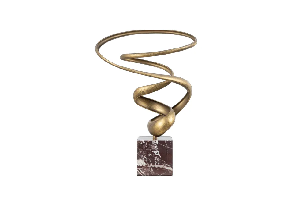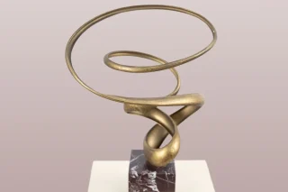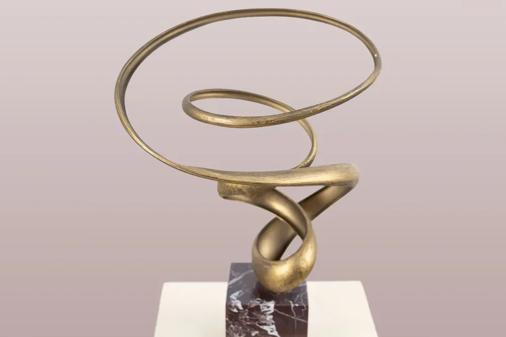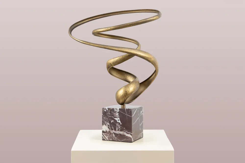 Tượng Looped Elevation lấy hình ảnh dải kim loại xoắn tròn vươn lên, hoàn thiện tông đồng vàng trên đế đá marble đỏ trầm. Đường cong liên tục hướng lên tạo cảm giác chuyển động nhẹ nhàng mà đầy năng lượng, như một điểm sáng trong không gian. Phù hợp với không gian Contemporary, Modern Luxury.