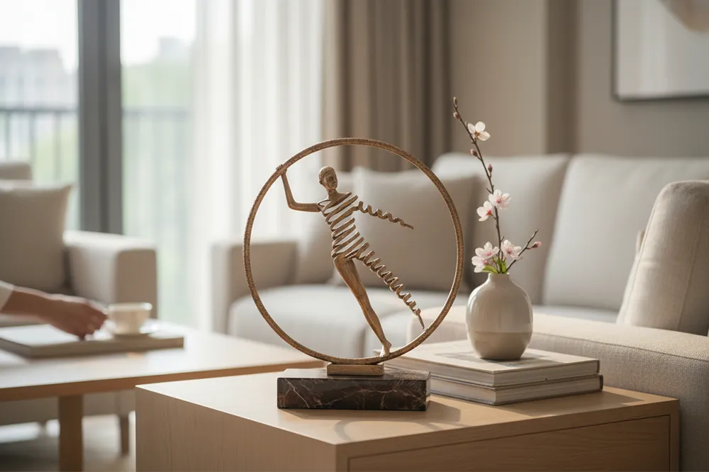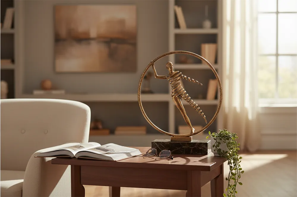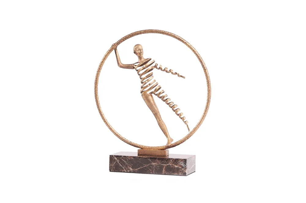 Tượng Woman In Circle khắc họa người phụ nữ cách điệu trong vòng tròn kim loại tông đồng vàng, đặt trên đế đá marble chắc chắn. Hình ảnh mang lại cảm giác tròn đầy, nhẹ nhàng và đầy tự tin, tôn vinh vẻ đẹp nữ tính hiện đại. Phù hợp đặt trong các không gian Contemporary, Modern Classic.